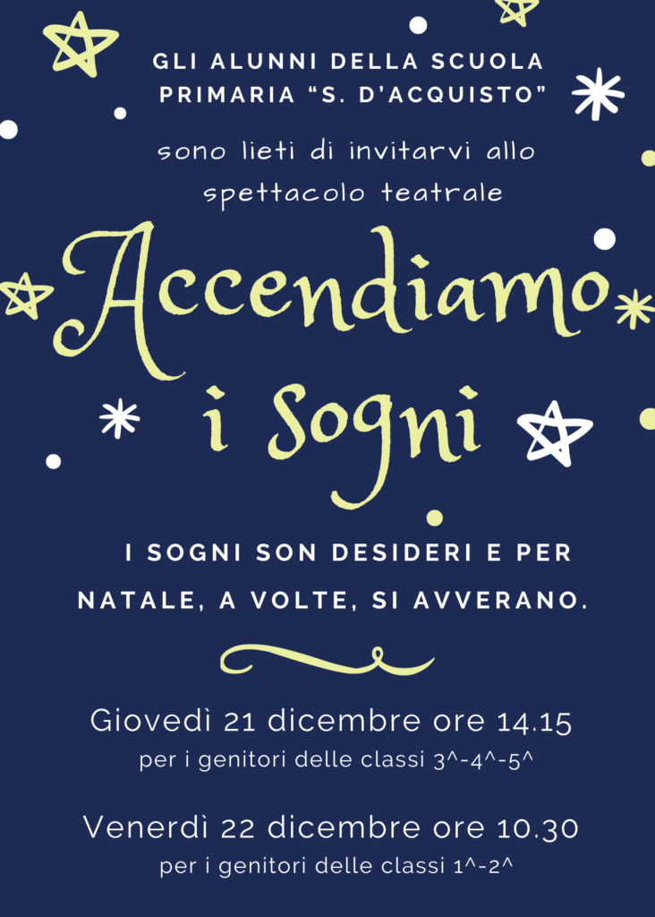 In occasione del Natale gli alunni della scuola primaria S.D’Acquisto presentano lo spettacolo teatrale “Accendiamo i sogni”. Tutti i bambini hanno sogni, speranze e grandi desideri, ma c’è un bambino in particolare che nutre un desiderio speciale: da grande vuole fare lo stelliere! Ma cosa fa uno stelliere? Ogni notte accende tutte le stelle dell’universo e, per ogni stella che brilla, nasce un nuovo sogno. A volte i sogni, proprio come le stelle, ci sembrano lontani e irraggiungibili, ma spesso sono più vicini di quanto immaginiamo…
