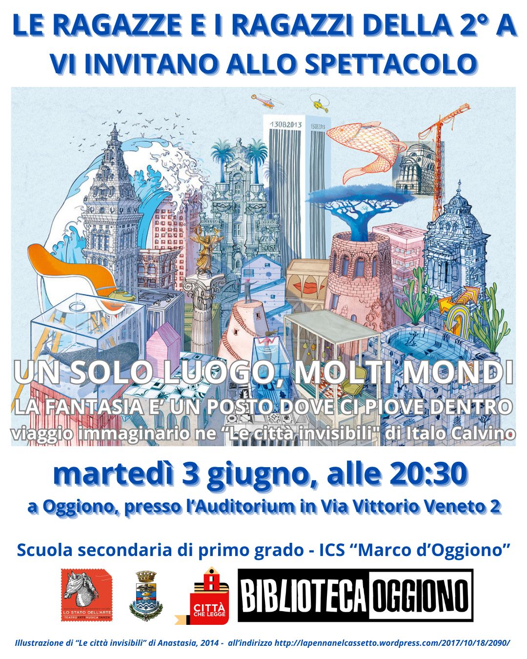 Tra le numerose iniziative attuate dal nostro Istituto anche quest’ anno, in collaborazione con la Biblioteca di Oggiono, è stato realizzato un laboratorio teatrale a cura dei ragazzi della classe seconda A e dell’ Associazione “Lo Stato dell’ Arte” nella persona di Alberto Bonacina. Partendo dalla lettura di alcuni stralci de “Le città invisibili” di Italo Calvino (di cui ricorre l’ anniversario) e facendosene suggestionare, i ragazzi hanno costruito una rappresentazione evocativa e immaginaria alla quale siete tutti invitati il 3 giugno alle ore 20,30 presso l’ Auditorium della Scuola Secondaria di Primo Grado. Vi aspettiamo numerosi per assistere allo spettacolo: “UN SOLO LUOGO, MOLTI MONDI. LA FANTASIA E’ UN POSTO DOVE CI PIOVE DENTRO”.