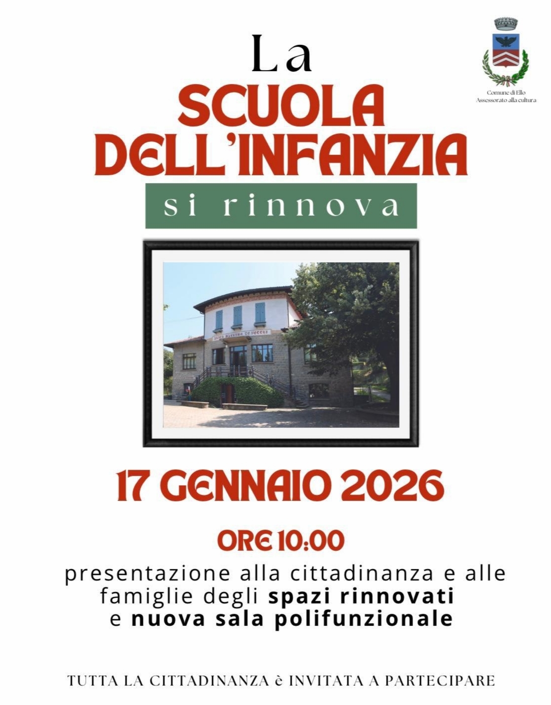 siamo lieti di comunicare che sabato 17 gennaio p.v. , a partire dalle ore 10:00, saranno aperti e quindi visitabili, i rinnovati spazi della Scuola dell’Infanzia di Ello “Massimo De Vecchi”, oggetto di un recente intervento di riqualificazione con la nuova sala polifunzionale.